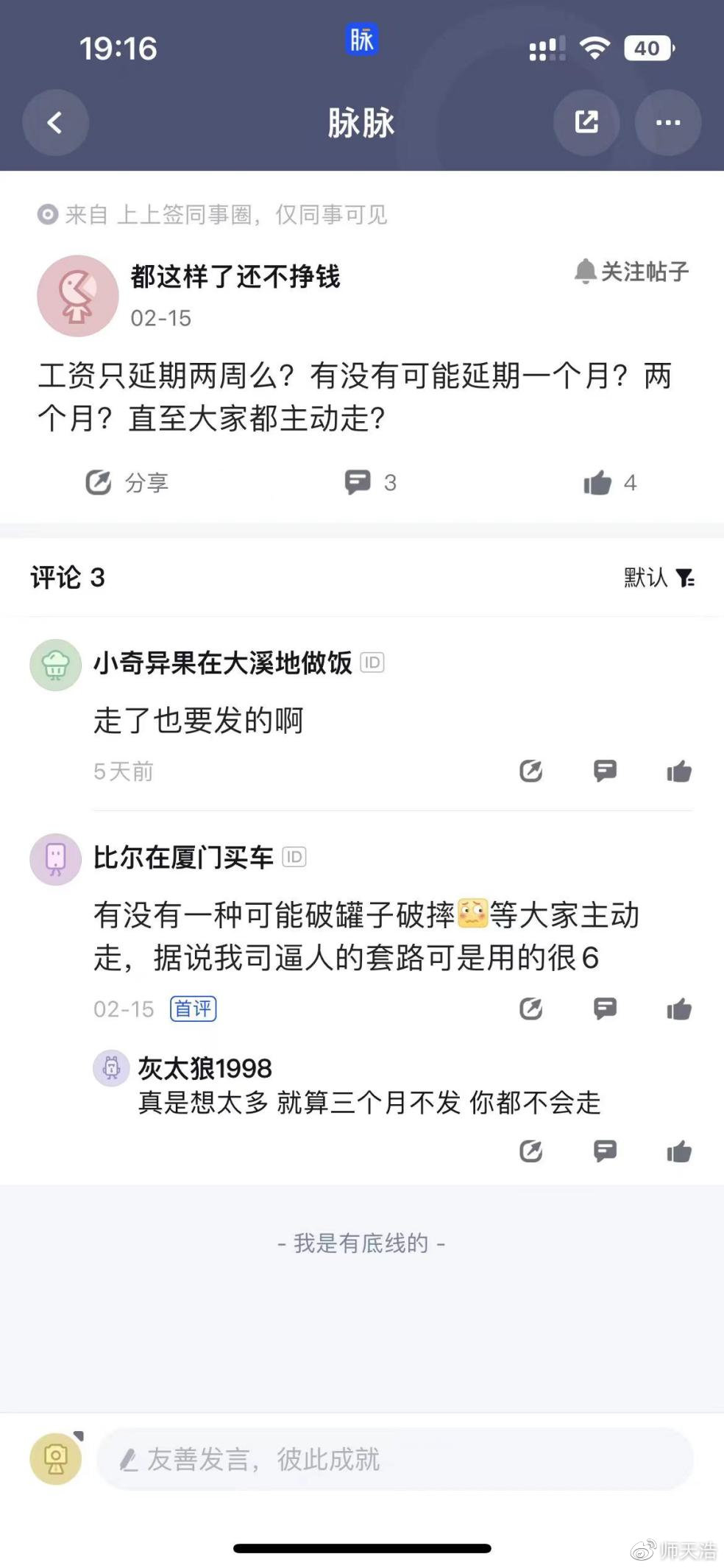在脉脉平台的上上签同事圈中,有疑似上上签员工发帖称,“工资只延期两周么?有没有可能延期一个月?两个月?直至大家都主动走?”下边有人回复,“走了也要发的啊”、“有没有一种可能破罐子破摔,等大家主动走,据说我司逼人的套路可是用的很6”。