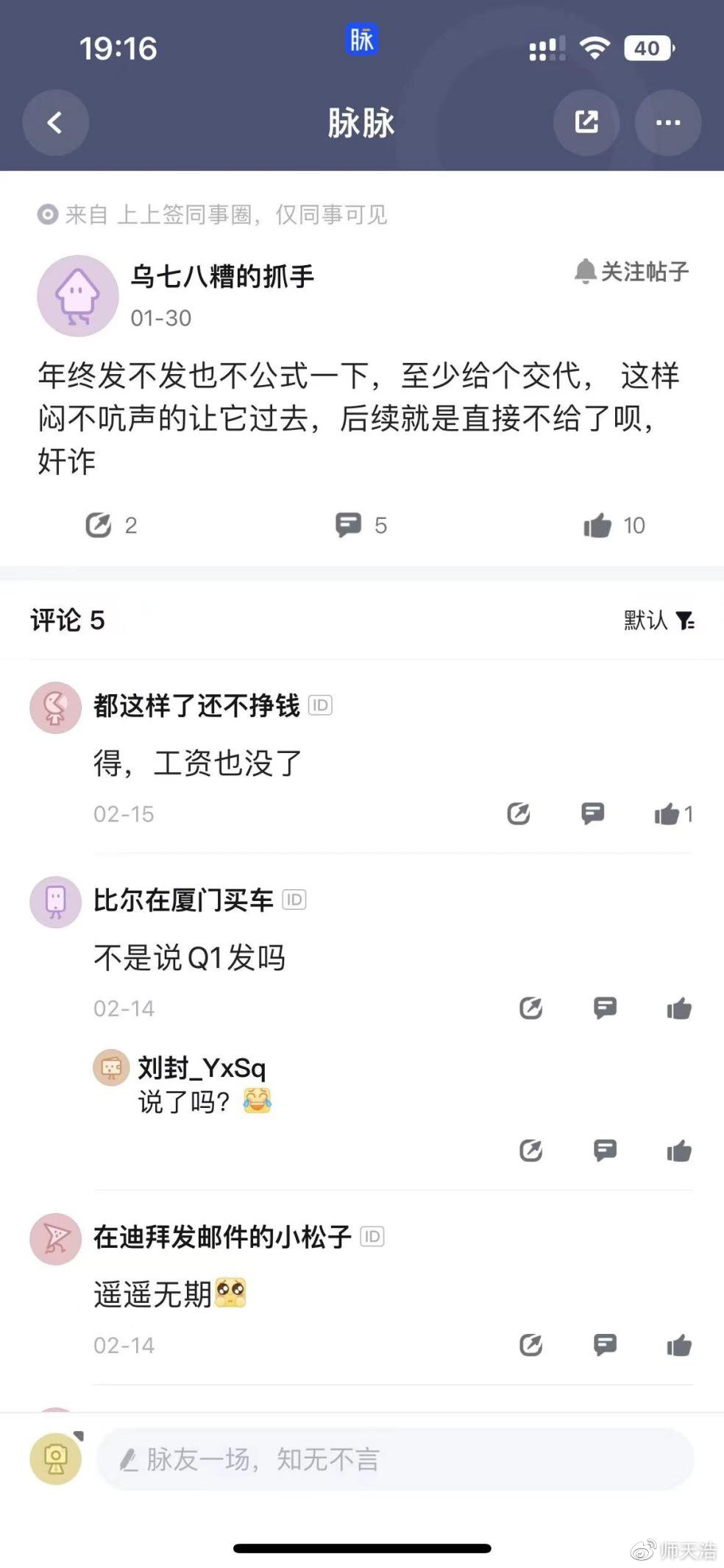 也有疑似上上签员工发帖称,“年终发不发也不公式一下,至少给个交代,这样闷不吭声的让它过去,后续就是直接不给了呗,奸诈”,底下有人评论,“得,工资也没了”、“不是说Q1发吗”、“遥遥无期”。