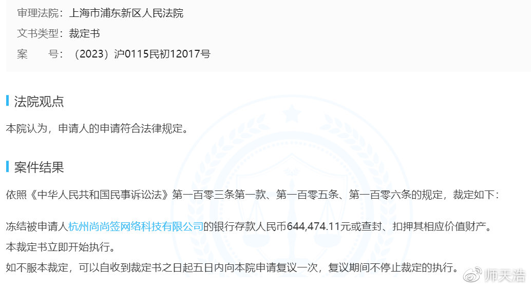 据天眼查显示,就在今年2月5日,上上签出现了一起诉讼,而且该诉讼还几经波折。原告是一家广告公司,双方的纠纷疑似与拖欠广告费有关,案件金额为644474.11元,根据裁定,被申请人杭州尚尚签网络科技有限公司的银行存款人民币6444474.11元需要被冻结,或者查封、扣押其相应价值财产。