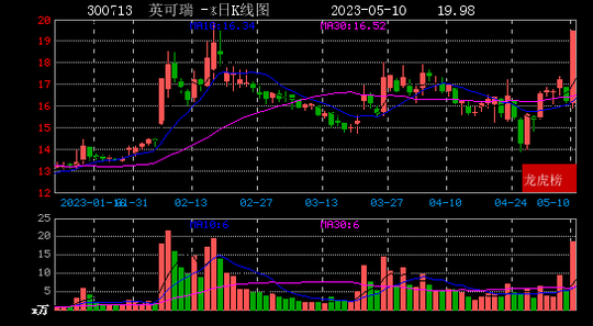 截止收盘,英可瑞报收19.46元/股,涨幅19.98%,成交量18万手,成交额3.44亿元,换手率21.83%。今日1板。