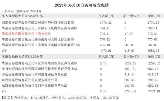 买入前5席为:国泰君安证券股份有限公司福州华林路证券营业部、华泰证券股份有限公司上海静安区威海路证券营业部、华鑫证券有限责任公司上海分公司、华鑫证券有限责任公司佛山南海海五路证券营业部、华泰证券股份有限公司上海黄浦区黄陂南路证券营业部。共计买入:4770.91万元,共计卖出:115.67万元。