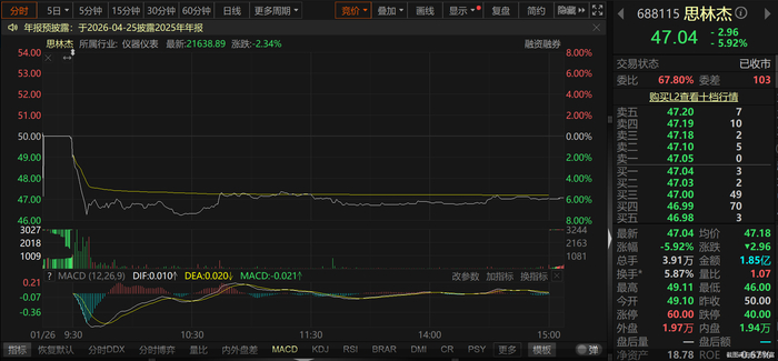 1月26日,思林杰低开1.8%,开于49.1元/股,开盘后公司股价保持低位震荡态势,盘中一度跌超7%。截至当日收盘,公司股价收跌5.92%,收于47.03元/股,总市值31.36亿元,当日成交金额1.85亿元。拉长时间线来看,1月19日—26日这6个交易日内,思林杰股价区间累计跌幅达33.84%,而同期大盘涨幅为0.75%。